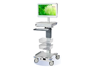 Medyczna mobilna stacja robocza X3PLUS B do pracy w warunkach szpitalnych, bloku operacyjnego, OIOM, SOR, OAIT z własnym zasilaniem lub bez (do komputerów z własnym zasilaniem 24/7). Zbudowana jest na konstrukcji aluminiowej wyposażonej w szyny montażowe, przeznaczone na półki i szuflady wg życzenia klienta. Podstawa jezdna, czterokołowa z hamulcem każdego koła (kolorowe wykończenie do wyboru). Wózek może być wyposażony w wysuwaną półkę na klawiaturę, mysz oraz blat roboczy z regulacją wysokości.