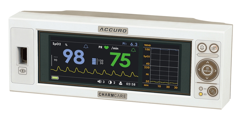 - ACCURO to nowoczesne i profesjonalne pulsoksymetry stacjonarno-transportowe służące do pomiarów czasowych i monitorowania saturacji i częstotliwości tętna wraz z pamięcią wyników badań i opcjonalną możliwością przesyłu danych do drukarki w celu ich pełnej archiwizacji.